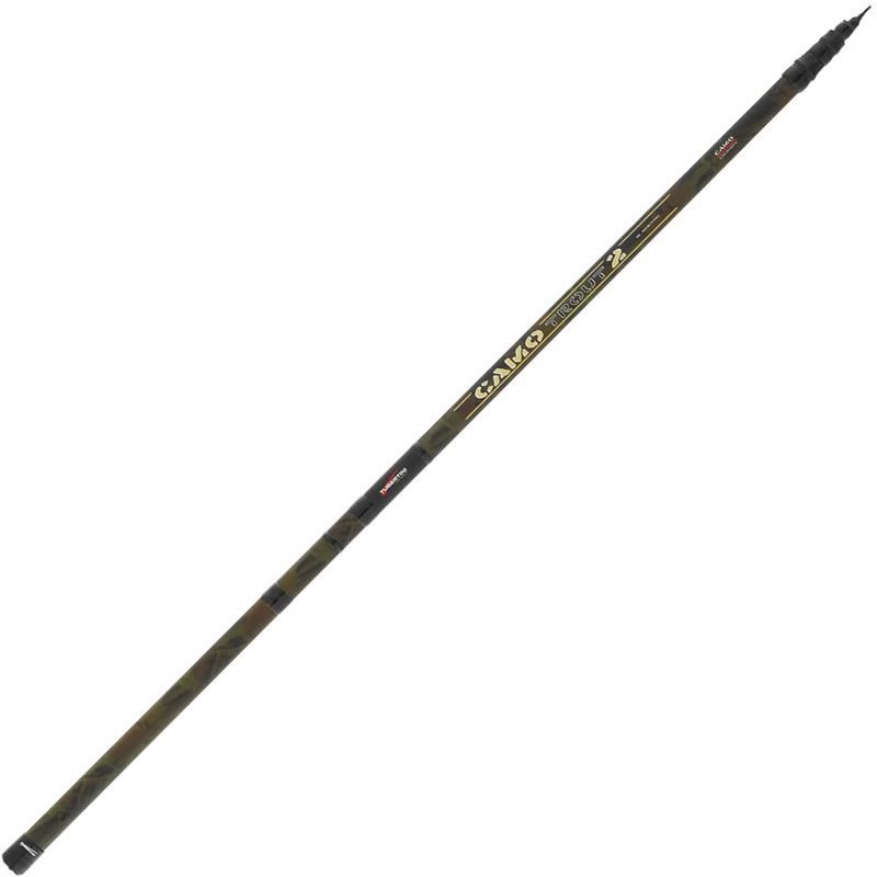 Comparée au modèle précédent la canne Camo Trout 2 est plus fiable et performante grâce à ses renforcement en carbone à haut module, et ses anneaux à pieds courts pour plus de force. Finition « Camo » classique. Elle est équipée de blocs pour ajuster la longueur: 1 bloc sur la 5 mètres, 2 sur la 6 m, et 3 sur la 7 m.